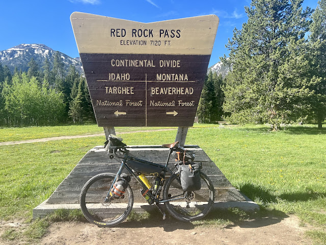I got to the top of 7,120’ Red Rock Pass and once again crossed the Continental Divide. I was back on the Atlantic side. I entered Montana and was now in my fifth and final state. I was also now in Beaverhead National Forest. There was a welcome sign for the southbound tour dividers and three racers were there taking photos. I took one too. Idaho, I only spent one night with you. You are gorgeous! The smooth cinder ended and Montana served up big chunky rocks and dirt. I was noticing a possible issue with my rear brake, which was making alarming high tension pings. I passed another Tour Divider.