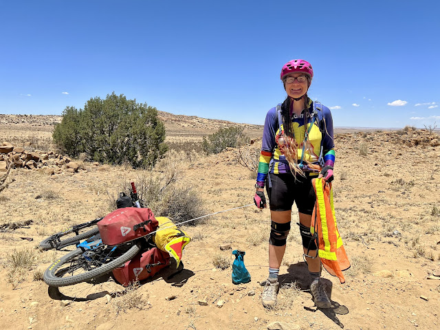 I entered the Sandoval Ranch which had been established in 1976. I noticed a bright red object ahead on the side of the road. It was a bicycle. I met southbound cyclist Carla from California whom had been enjoying lunch underneath a tree. She was touring the New Mexico section of the Great Divide, and told me about water sources and camping possibilities to the north. She mentioned that there were three northbound cyclists two days ahead of me.